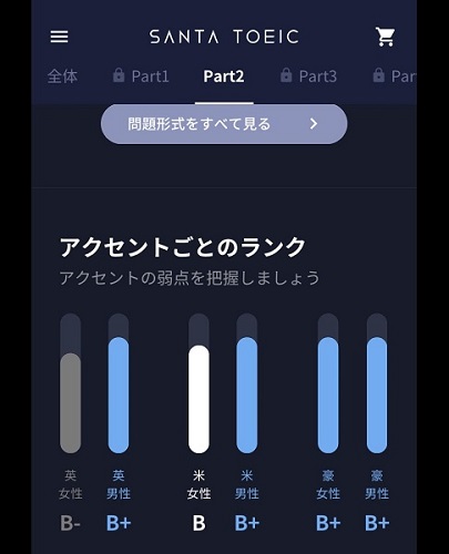 リスニングではアメリカ・イギリス・オーストラリアの男性と女性別での弱点ランクが表示されるので、自分が苦手な発音のタイプを知ることもできます。