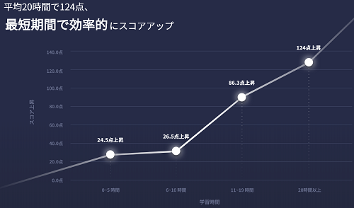 仮に毎日3時間学習をしても、少なく見積もって2カ月はかかる計算になるので、『20時間の学習でスコアが124点アップ』がいかに驚異的な数字か分かります。