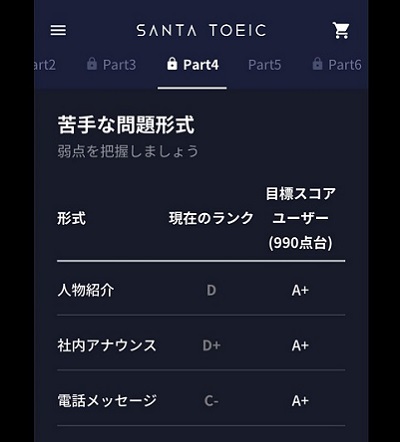 苦手な問題形式ごとにAからFでランク付けしてくれるので、目標スコアまでどのくらい足りないのかを把握して重点的に学習に取り組めます。